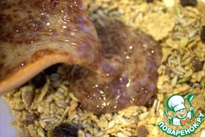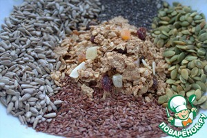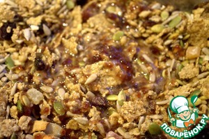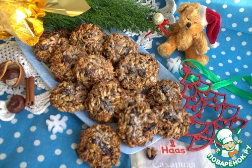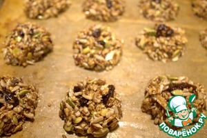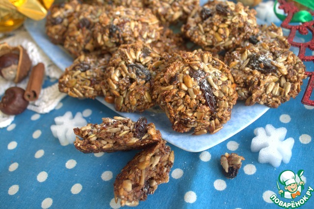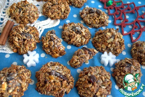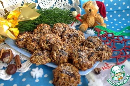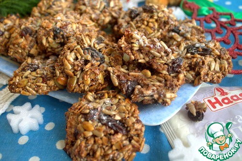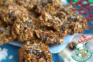 Очень ленивое печенье. Просто надо было истратить последнюю порцию сухого завтрака и освободить коробочку. Далее всё по наличию семечек-цукатов-сухо фруктов в доме. Подходит для сладкого подарка.