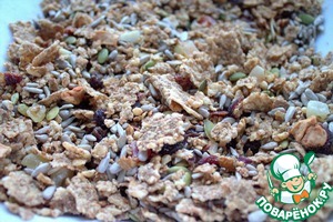 Вот такие цельнозерновые сухие хлопья для завтрака у меня остались. В них уже были цукаты, изюм и вяленая клюква, иначе я бы их тоже добавила. Нет таких хлопьев, берём обычные жёлтенькие, тоже есть в доме для хрустящей панировки.
