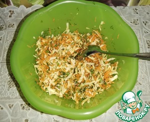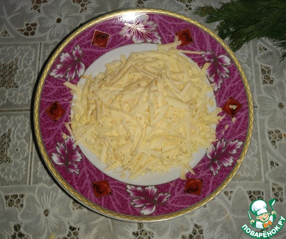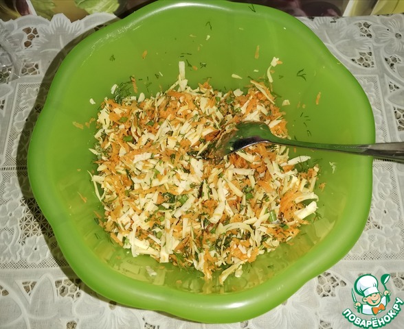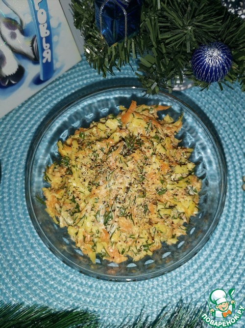 Салат посолить (я не солила), заправить майонезом, сверху присыпать свежемолотым чёрным перцем.