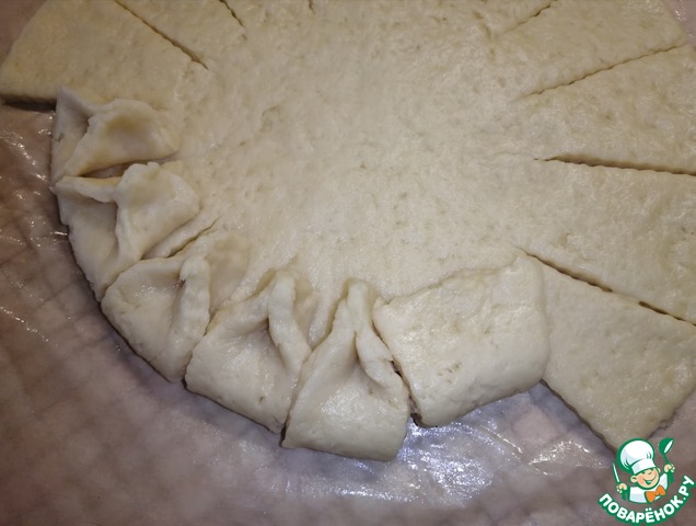 Раскатать тесто в круг (у меня получилось 32см*32см), толщиной 1 см.