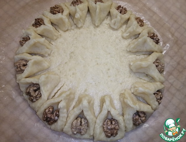 В середину пирога сделать кругляшок из оставшегося теста, сверху положить орех.