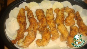 Картошку нарежьте тоненькими кольцами, противень смажьте маслом и выложите туда половина картофеля, посолите