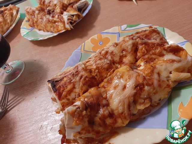 Берем лаваш, выкладываем начинку и сворачиваем трубочкой. Кладем в форму швом вниз. Когда все энчиладас будут готовы, сверху заливаем оставшимся соусом, присыпаем оставшимся сыром (100г) и выпекаем в разогретой до 180 градусов духовке минут 20, пока сыр не станет красивого золотистого цвета.