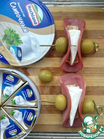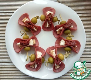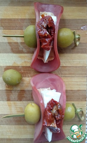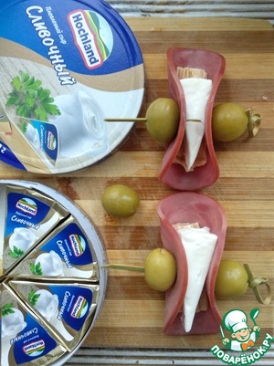 Скрепить нарезку шпажкой, нанизав по бокам оливки.