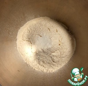 Муку просеять в миску, затем добавить щепотку соли и 0,5 ч. л. соды. Перемешать.
