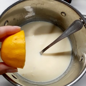 Горячий крем накрыть пленкой "в контакт". Остудить до комнатной температуры, добавить лимонный сок.