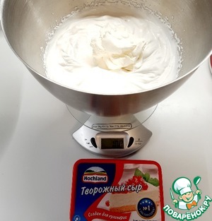 Охлаждённые сливки взбить с сахарной пудрой и ванильным сахаром до устойчивых пиков. Добавить холодный творожный сыр, взбить. Порционно вмешать сгущеное молоко и заварную составляющую крема.