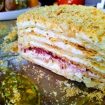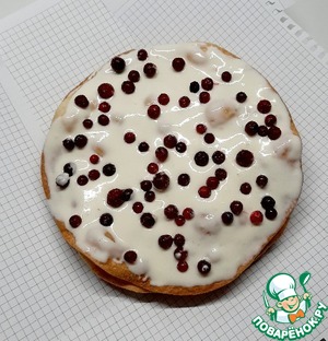 Коржи промазываем щедро кремом, после каждого четвёртого коржа посыпаем брусникой. Оставьте собранный торт при комнатной температуре на час для пропитки. Он остядет и тогда можно обсыпать крошкой.
