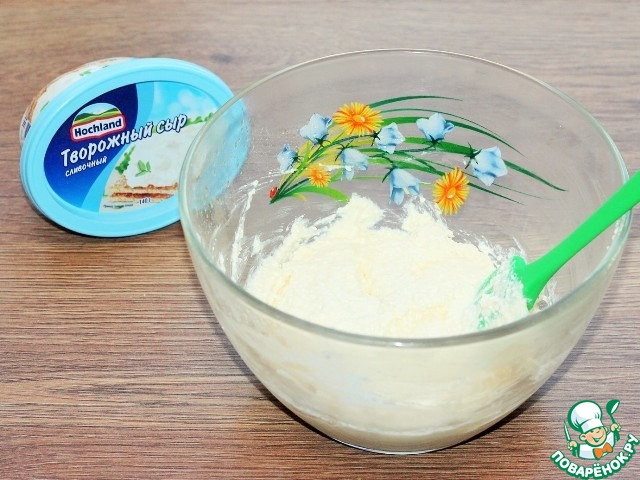 1. Творог смешать с яйцом и пропустить через сито. В творожную смесь добавить мягкое сливочное масло, творожный сыр Hochland, сахар, ванилин и соль. Перемешать венчиком.
