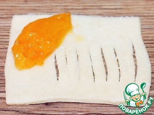 6. Переворачиваем заготовку и кладем варенье, где нет надреза. Варенье, желательно густое.
