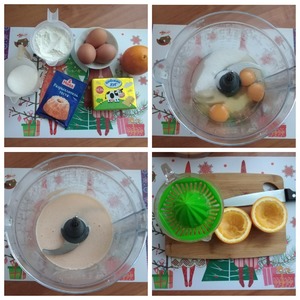 С этого же апельсина снимаем цедру ~ 1 ч л. Сок апельсиновый и цедру отправляем к взбитой смеси яиц с сахаром, соединяем. Масло сливочное растапливаем. Я использую СВЧ 55 секунд при мощности 800. Отправляем масло к смеси, соединяем. Просеиваем муку и добавляем разрыхлитель. Опять соединяем. Тесто готово.