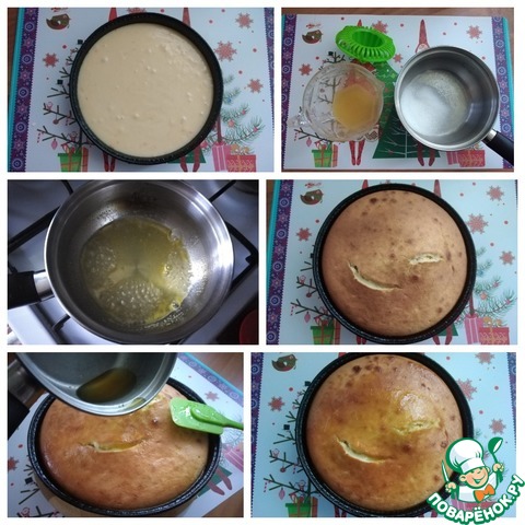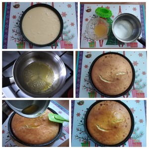Тесто по консистенции такое, что свободно выливается через носик в форму. Я взяла разовую круглую форму D-18,5 см и высотой-4 см. Количества теста подойдёт для классической формы для кексов (прямоугольной формы). Поставила в духовку на 30 минут, выставив Т-180 С. За минут 5 до окончания времени, проверила на "сухую лучину". К лучине тесто не пристаёт и она сухая - готов! Ориентируйтесь по своей духовке. Нужно сделать пропитку для кейка, чтобы она была готова к окончанию выпечки кейка. Прямо горячий кейк пропитать горячей пропиткой. Нужно отжать сок с одного апельсина. В посуде, которую можно поставить на плиту, соединить сок с сахаром и довести до кипения, варить пару минут. Вынув кейк из духовки, пропитываем его сразу же.