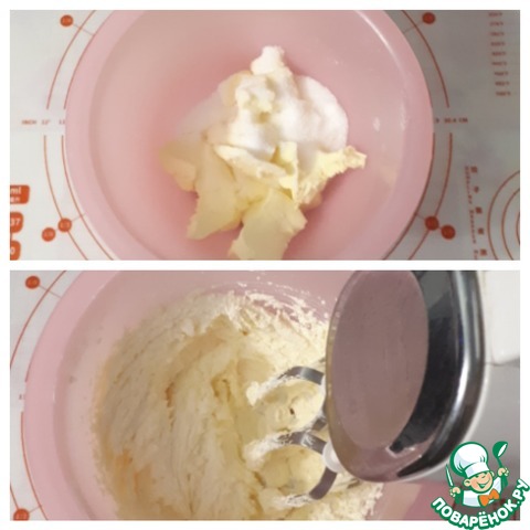 Сахар хорошо взбить с маргарином или сливочным маслом до пышной массы.