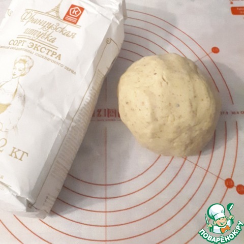 Добавить предварительно просеянную муку и замесить тесто, скатать его в шар и положить на 30-40 минут в холодильник. В рецепте я использую муку "Французская штучка", сорт экстра.