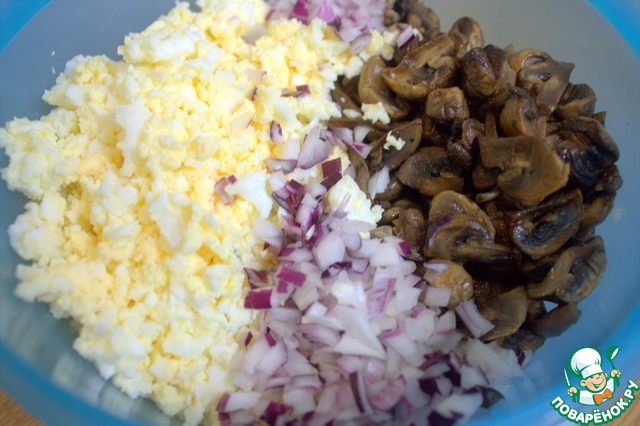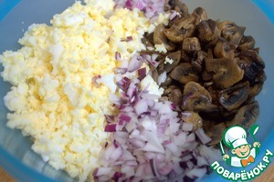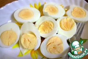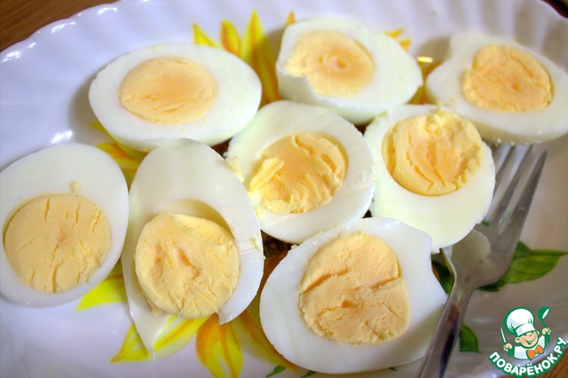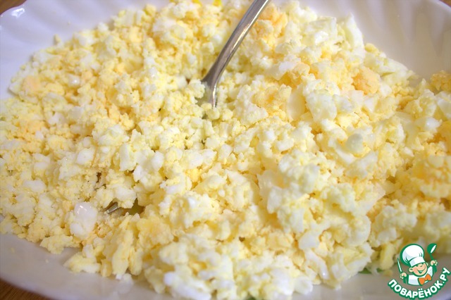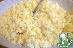 Размять вилкой. Мне так больше нравится, но можете на яйцерезке измельчить.