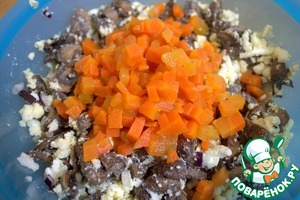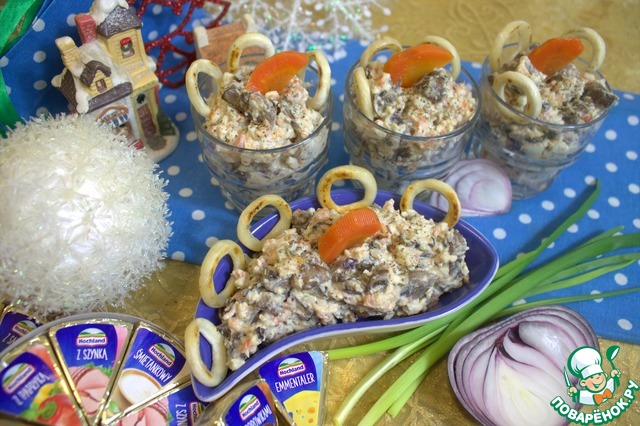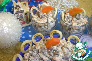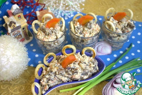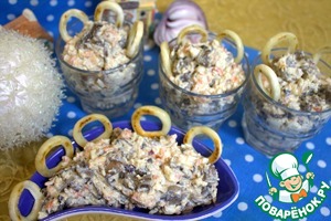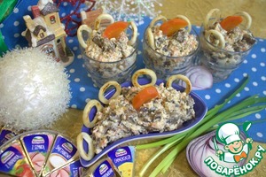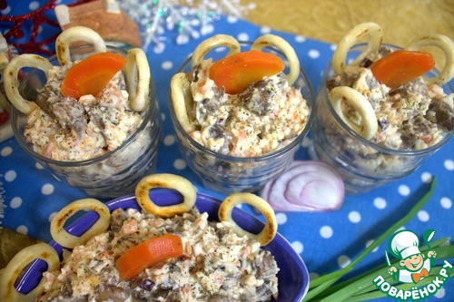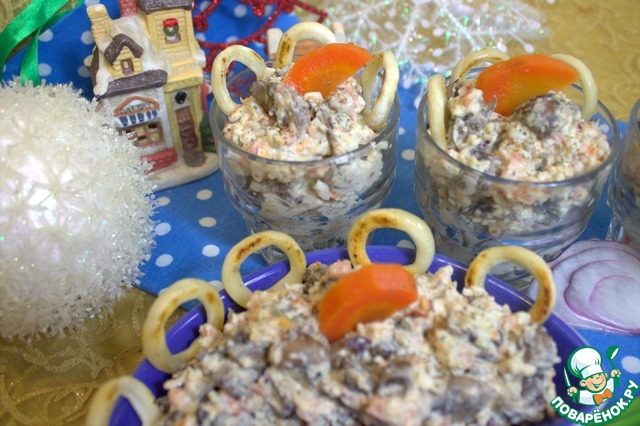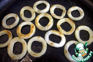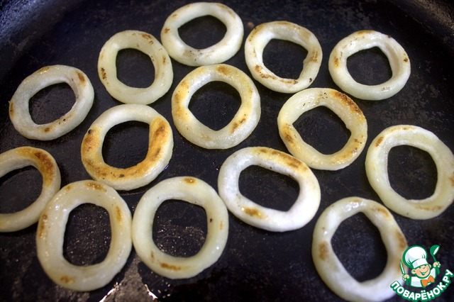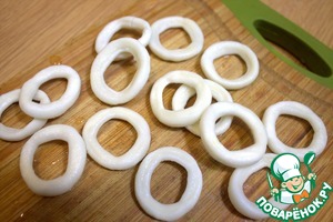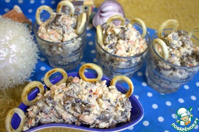 Украшаем кальмаровыми кольцами, морковкой и зеленью.
