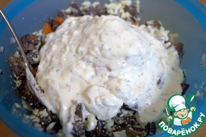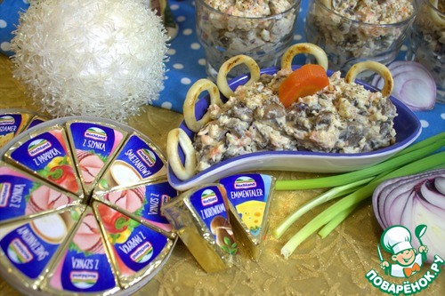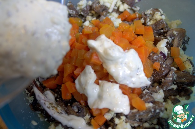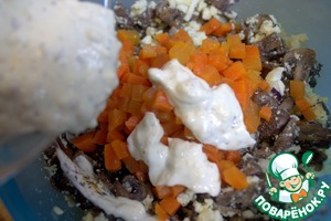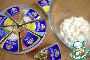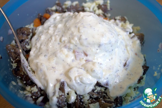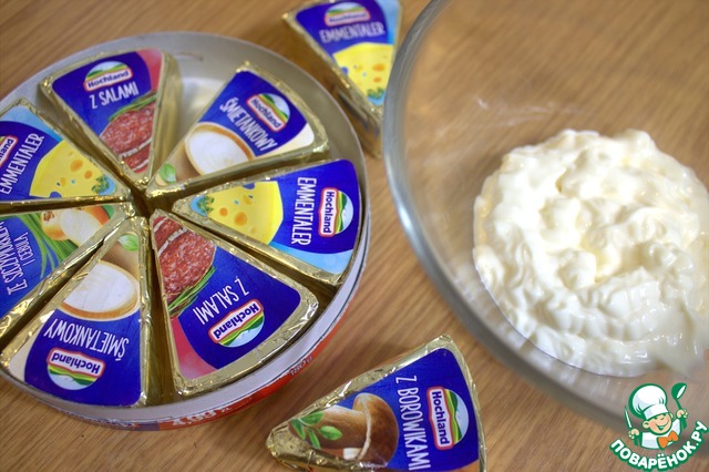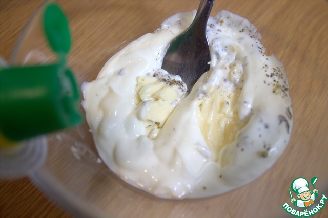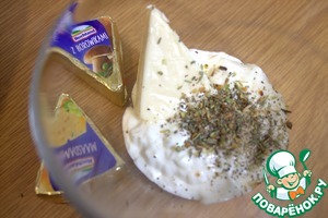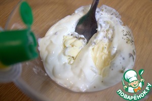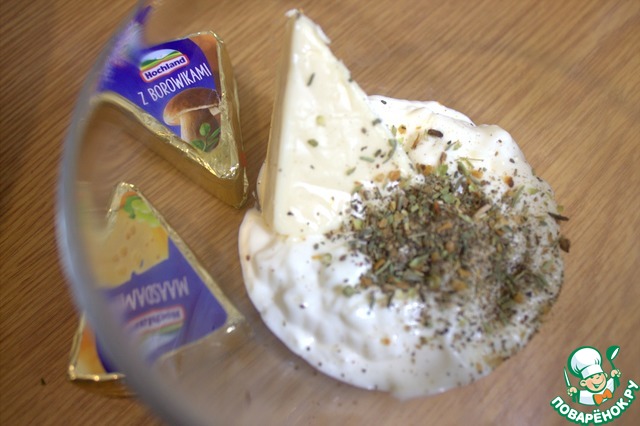 В майонез размять сырочки. Подойдут с боровиками, с луком, сливочные. Смесь трав, перец, соль.