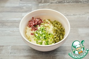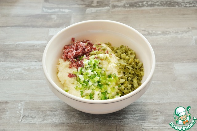 Добавьте к полученной массе мелко нашинкованную сырокопченую колбасу, корнишоны и зеленый лук. Перемешайте до однородной массы