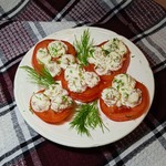 Можно нафаршировать половинки некрупных помидор, если не нравится вариант на кружочках. -
