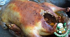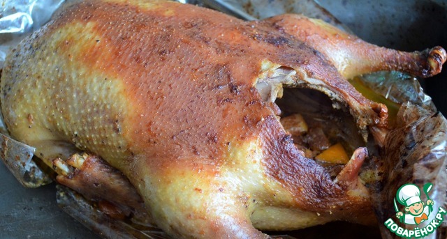Запекать утку при 160 градусах, 2 часа. Затем пакет вскрыть и ещё 10 минут при 200 градусах, полив внутренним жиром.