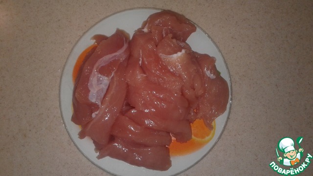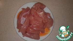 Филе индейки тонко нарезать и чуть-чуть посолить.