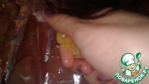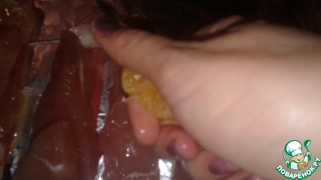 Очистить от кожуры мандарин и выдавить сок на индейку.