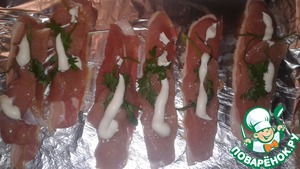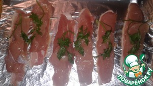 Выложить кусочки филе индейки на ломтики бекона.