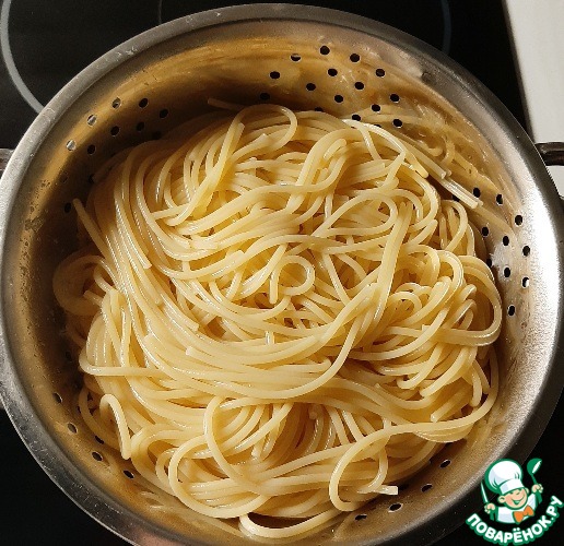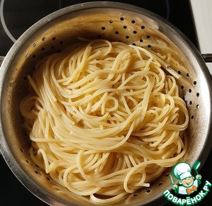 Спагетти отварить в подсоленной воде, откинуть на дуршлаг, вернуть в кастрюлю, полить оливковым маслом, перемешать.