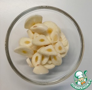 Соус готовится очень быстро. Поэтому сначала почистить чеснок и нарезать пластинками. На сливочном масле немного обжарить, около минуты.