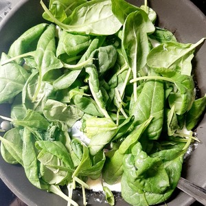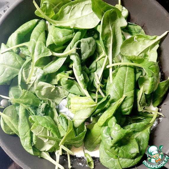 Как только шпинат пожухнет, добавить креветки. Если сырые, то готовить их до розового цвета, а если готовые - прогреть минуту.