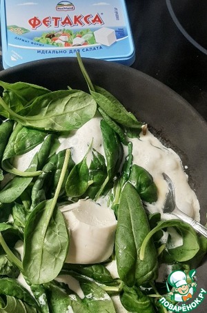Сразу же добавить сыр Фетакса. Он хорошо плавится и соус становится гуще и насыщеннее по вкусу. Перемешать.