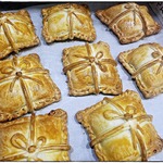 Тоже самое сделайте и со вторым пластом раскатанного теста. Из обрезков теста сделать узоры и украсить пирожки по желанию, я сделала в виде перевязанного письма "Новогоднего послания". Выложить пирожки на противень застеленный пергаментной бумагой.
