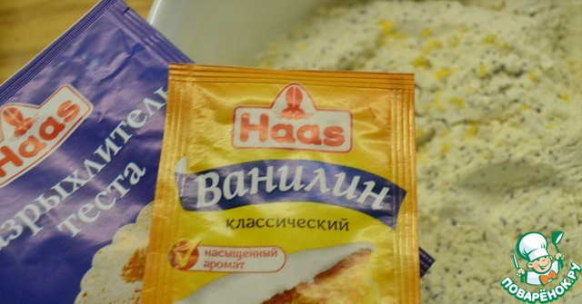 Смешать сухие ингредиенты: муку, сахар, мак, лимонную цедру, разрыхлитель, ванилин
