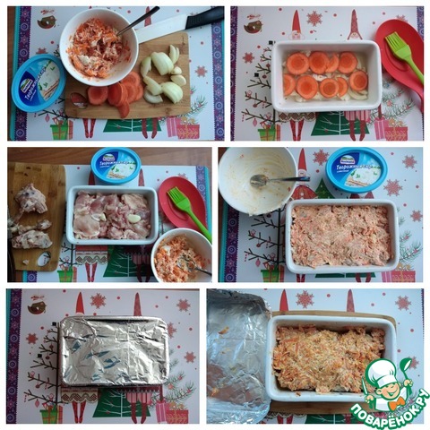 Для запекания паштета нам понадобится керамическая (стеклянная) форма. Половину моркови натираем на тёрке, а другую половину нарезаем кружочками. Лук режем полу-кольцами, дольки чеснока чистим. Творожный сливочный сыр Hochland соединяем с натёртой морковью и добавляем щепотку прованских трав. Прованские травы добавлять не обязательно, это по вкусу. Можно взять для паштета сыр творожный с зеленью Hochland. С бёдер снимаем мясо, кожу убирать не обязательно (по желанию). Нарезаем кусочками. Форму обмазываем маслом оливковым, которое можно заменить на любое вами любимое. На низ формы выкладываем лук. На лук - кружочки моркови. На морковь - куриное мясо. Кладём дольки чеснока. Теперь выкладываем морковно-творожную смесь и разравниваем её по всей поверхности. Солить и перчить не нужно. Это мы сделаем позже, когда будем разбивать всё в блендере. Накрываем форму фольгой и ставим в духовку на 40 минут при т-180 С. Этого времени достаточно, чтобы содержимое формы запеклось.