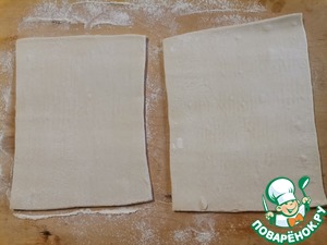 Слоеное тесто разморозить. Квадраты слегка раскатать и придать им прямоугольную форму.