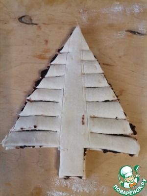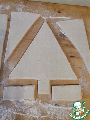 Вырезать острым ножом Ёлочку. Приложить её на второй прямоугольник теста и вырезать такую же.