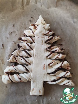 Аккуратно переложить ёлочку на противень застеленный пергаментом. Из веточек сделать спиральки, повернув их два - три раза от себя.