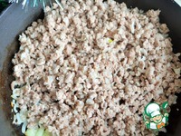 Заранее отварить говядину, измельчить на мясорубке, решётка крупная. На смеси масел обжарить лук, добавить мясо. Жарить 5 минут, огонь средний. |