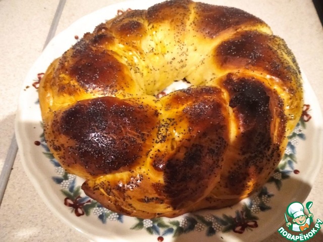 Спустя время, тесто подошло и увеличилось в размере. Подготовим поверхность - смазываем растительным масло, выкладываем тесто и ещё раз хорошо вымешиваем, затем делим тесто на части примерно по 200-250 грамм. Берём две части теста, раскатываем в жгут и скручиваем между собой, соединяем два края и формируем плетёнку (косичку). А так же калач можно сделать с любой начинкой, например у меня с цукатами, берём две части теста - раскатываем в жгут, каждый жгут немного разравниваем и в середину выкладываем цукаты, слепливаете края, сворачиваем два жгута между собой и формируем калач (косичку), перекладываем на противень. С небольшого кусочка теста - раскатываем тонкий жгут и делаем окантовку калача, ещё с одного маленького кусочка формируем листочек и выкладываем на калач в месте соединения двух краев. Калач смазываем яйцом взбитым с молоком, посыпаем сверху маком и оставляем на расстойку на минут 20-30 и отправляем в заранее разогретую духовку до 180 градусов, выпекаться 40-45 минут (в зависимости от вашей духовки), нам необходимо что-бы калач хорошо зарумянился. Готово, в конечном итоге у нас получаются очень вкусные, воздушные и сдобные Рождественские калачи. © Светлана Железняк