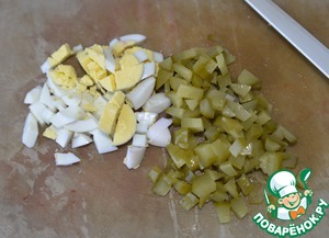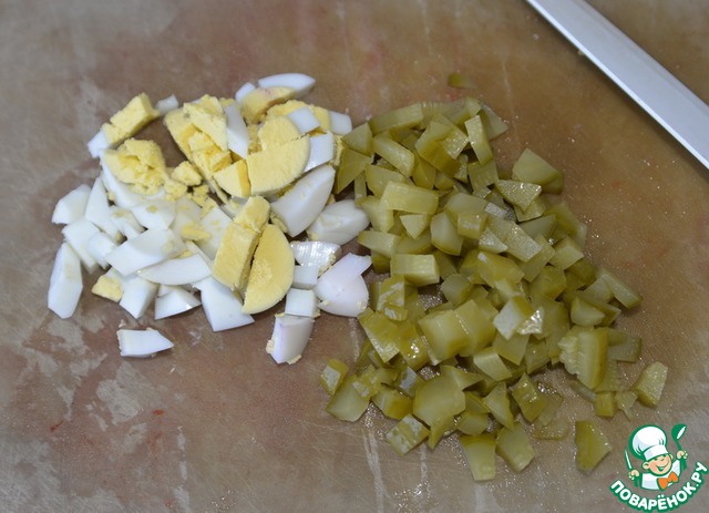 • Сыр плавленый заранее, за 30 минут, кладём в морозилку, чтобы легче было нарезать. Режем сыр кубиками, у меня Hochland.