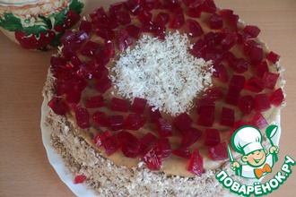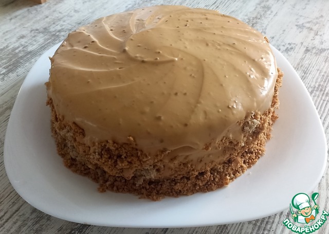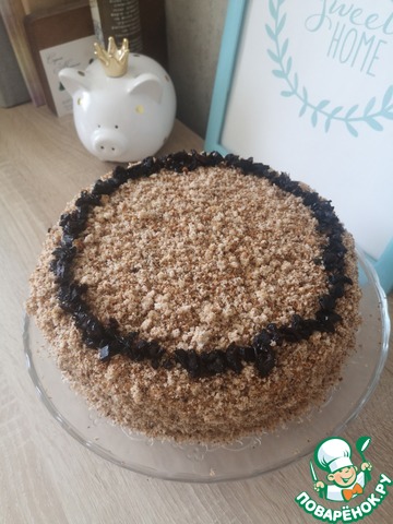 С готового торта снять кольцо, обмазать равномерно шпателем выступивший с боков крем и хорошо обсыпать крошкой со всех сторон.