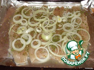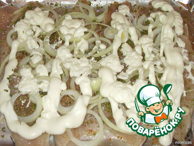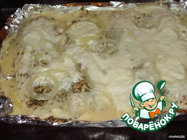Почистить лук и нарезать его кольцами. Посыпать рыбу(я его потом когда она приготовится у себя из тарелки вытаскиваю. Ну не люблю я лук....)Лук кладется для сочности и аромата. Полить смесью майонеза со сметаной.Можно просто майонезом.