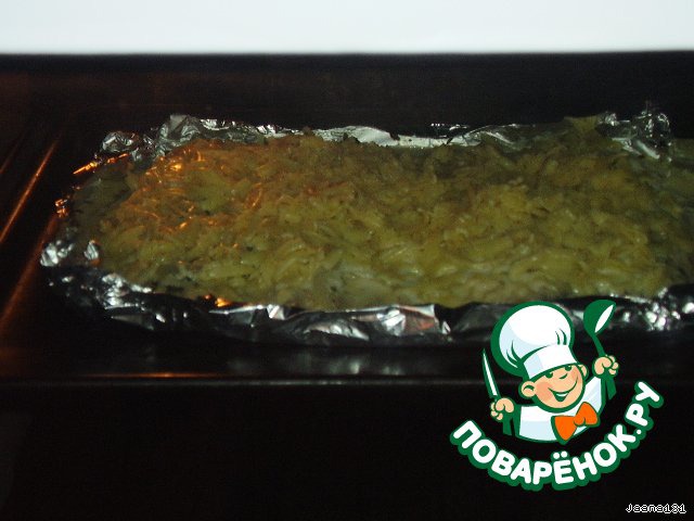 Накрыть рыбу вторым листом фольги и края защипнуть. Поставить в разогретую духовку. Потереть на крупной терке сыр.