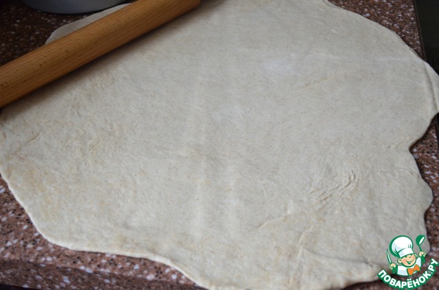Тесто накрыть плёнкой, убрать в тёплое место, на 1-1,5 часа, затем тесто обмять, расплющить на припылённом мукой рабочем месте.