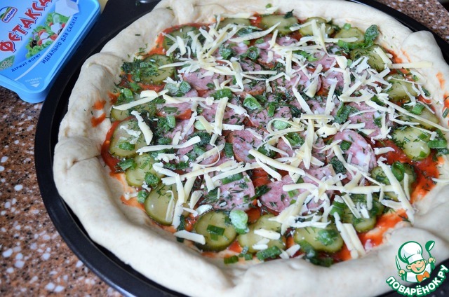 Накрыть фетаксу тестом, раскатать середину до одной толщины. Смазать центр томатным соусом. Разложить огурцы, колбасу, посыпать зеленью и стружкой голландского сыра.
