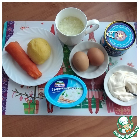 Готовим все продукты. Картофель и морковь нужно отварить в мундире, яйца - вкрутую. Лук ошпарить кипятком, чтобы ушла горечь. Вместо сливочного масла или плавленного сырка я буду использовать творожный сыр Hochland сливочный. Можно взять этой же марки с зеленью.