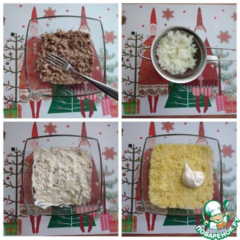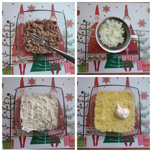 2 слой - ошпаренный кипятком лук и откинутый на ситечко, чтобы ушла вода с него + слой майонеза сверху