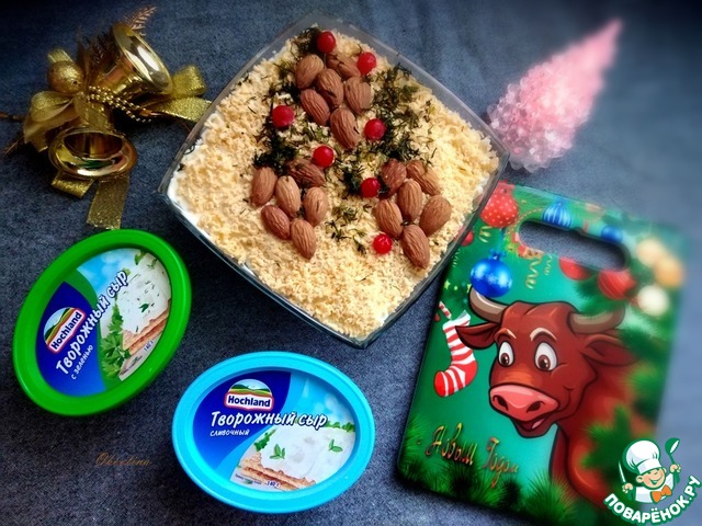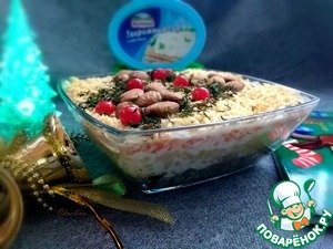 Так как салат делаю на Новогодние праздники, я его украшу сверху празднично. Из миндаля соберу "шишки", немного присыплю "хвоей" - укропом порезанным и украшу красными ягодами. Салат готов. Даём ему настояться. Раньше я его всегда делала до подачи на ночь и он у меня настаивался и пропитывался в холодильнике.