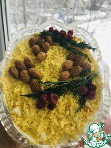 6 слой -желток натёртый на мелкой тёрке, который натирается прямо на собранный салат (он напомнит нам вид мимозы) и ничем больше не промазывается.