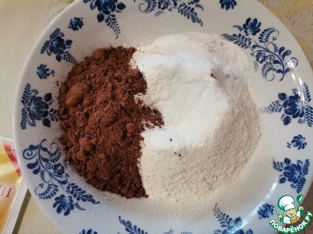 В мисочке смешиваем все сухие ингредиенты: муку, какао и разрыхлитель.